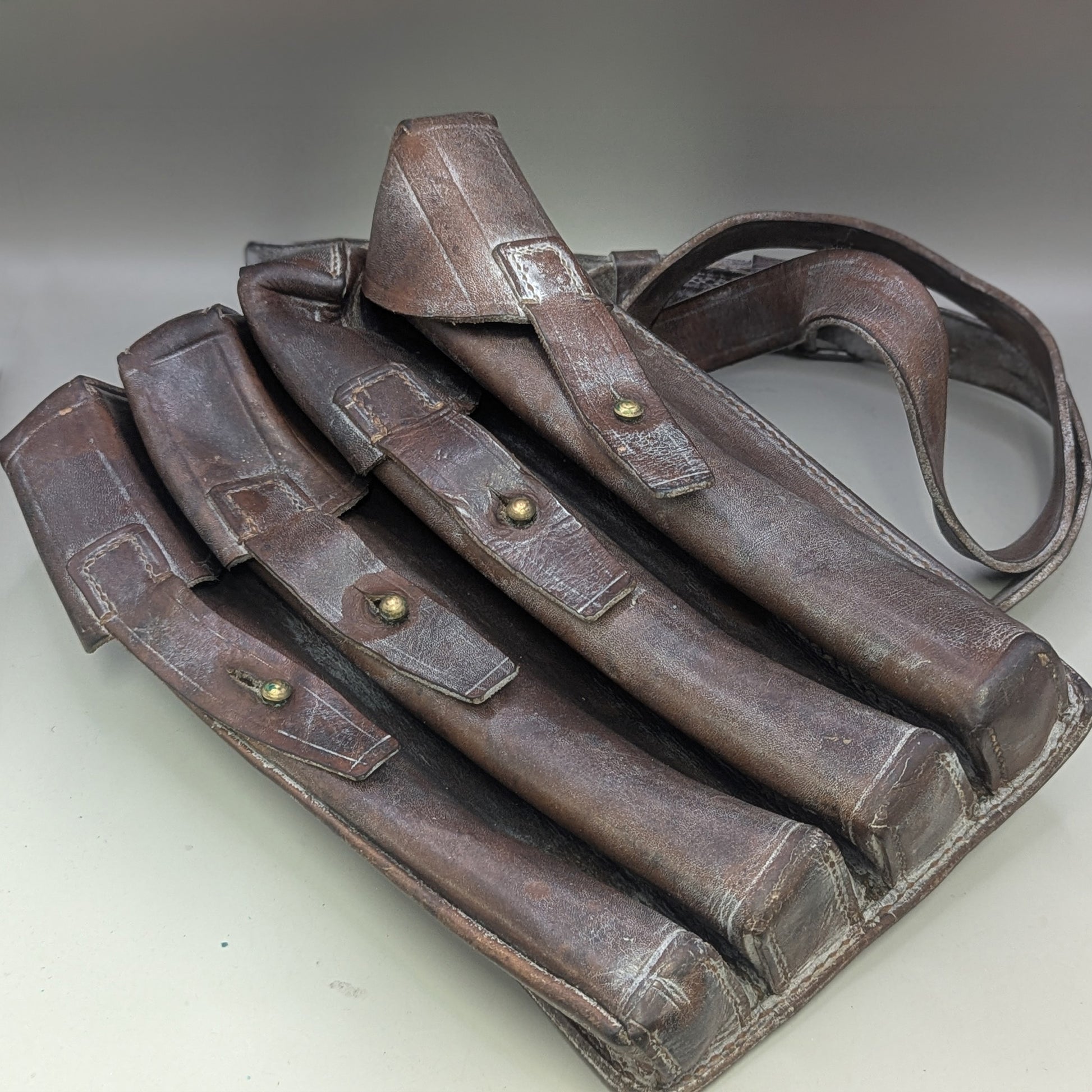 Authentische Leder-Magazintasche aus Militärbeständen – ausgestattet mit originalem Tragegurt, jedoch ohne zusätzliche Oiler-Tasche.